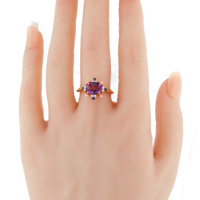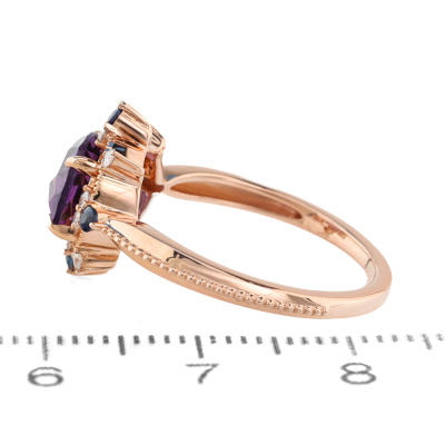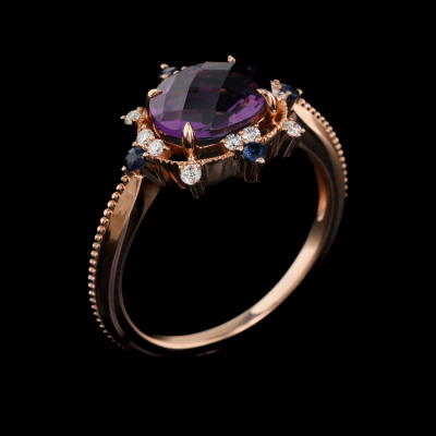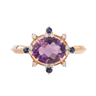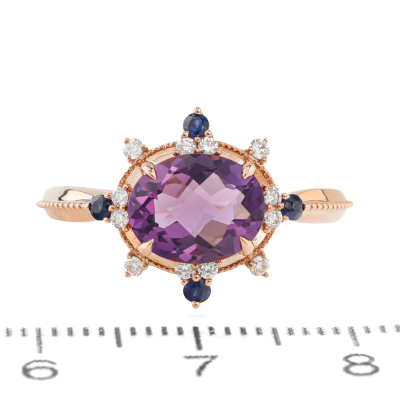 Amethyst and Diamond ring with oval shape Natural Amethyst of 1.63ct, round Natural Blue Sapphires totalling 0.11ct and round Natural Diamonds totalling 0.13ct. 14ct rose gold. Ring size: N. Weight: 3.2g. (New)