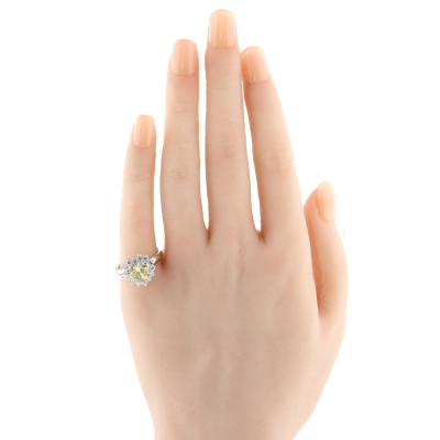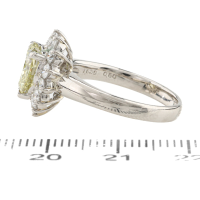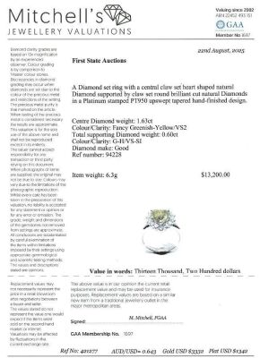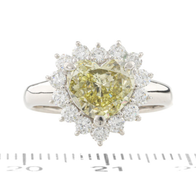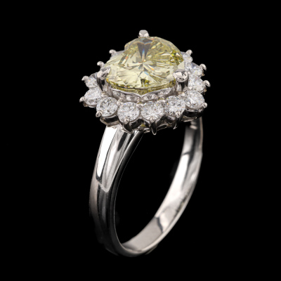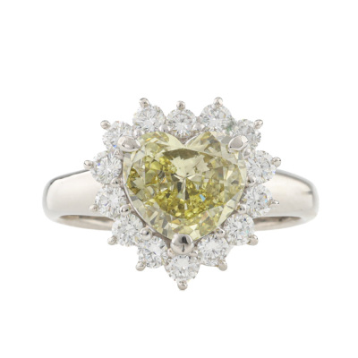 Diamond ring with centre heart shape Natural Diamond of 1.63ct (Estimated grading: Fancy Greenish Yellow VS2) and surrounding round Natural Diamonds totalling 0.60ct (Estimated grading: G-H VS-SI). Platinum - 950. Ring size M. Band width: 2.5mm - 2.8mm. Weight: 6.3g. With Certificate #421277. (Pre-owned)