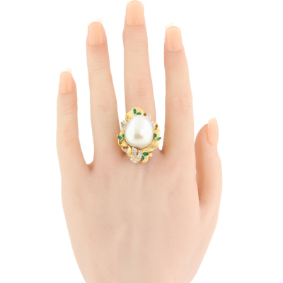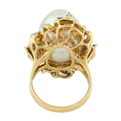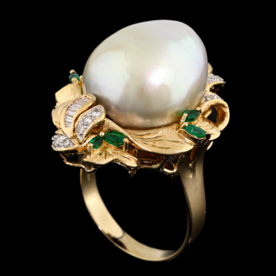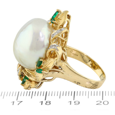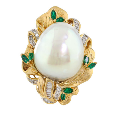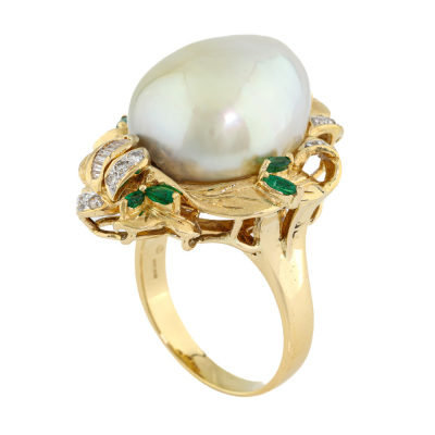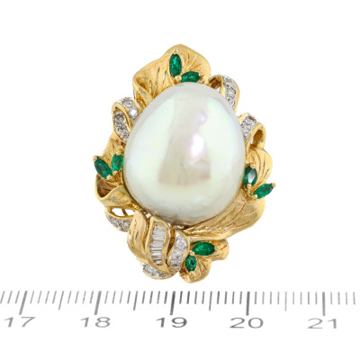 Pearl, Emerald and Diamond ring with centre drop shape South Sea Pearl of 16.3mm, marquise cut Natural Emeralds totalling 0.38ct and round & baguette cut Natural Diamonds totalling 0.28ct. 18ct yellow gold. Ring size Q 1/2. Band width: 3.1mm - 4.0mm. Weight: 20.2g. (Pre-owned)