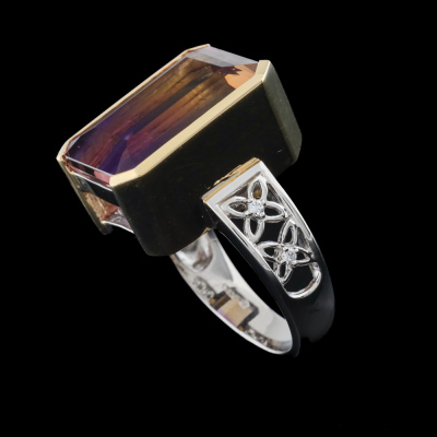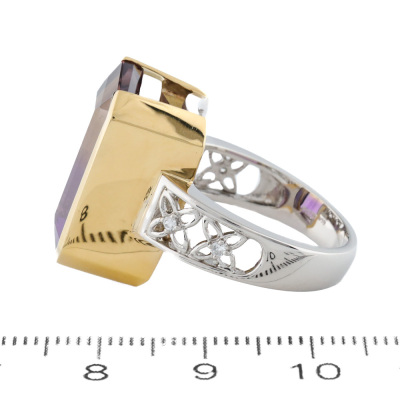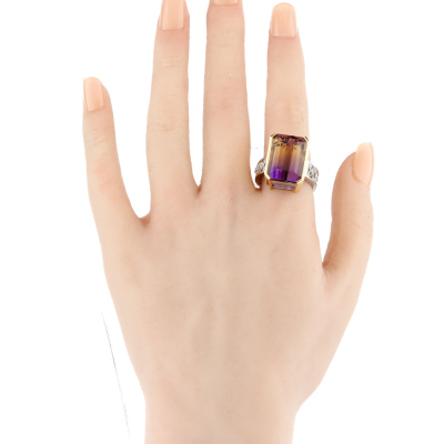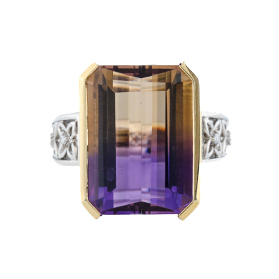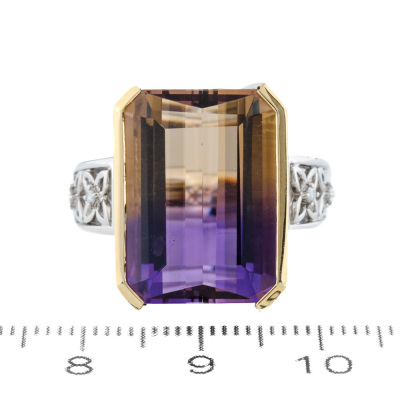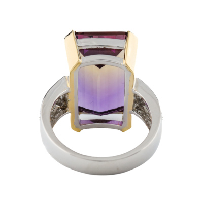 Ametrine and Diamond ring with centre emerald cut Natural Ametrine of 16.41ct and round Natural Diamonds totalling 0.05ct. Platinum - 900 and 18ct yellow gold. Ring size Q. Band width: 4.0mm - 5.2mm. Weight: 17.6g. (Pre-owned)