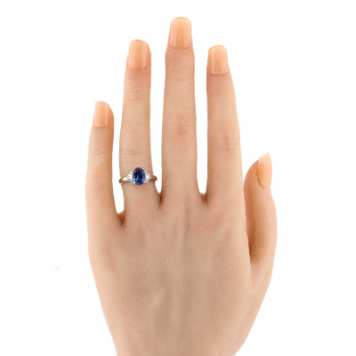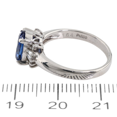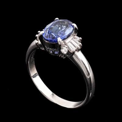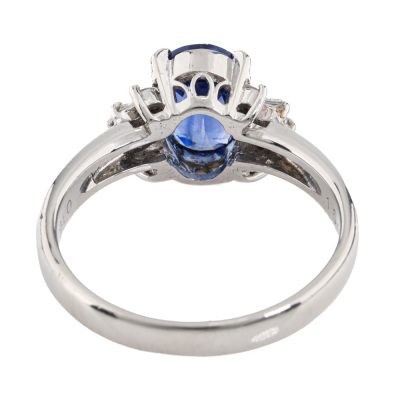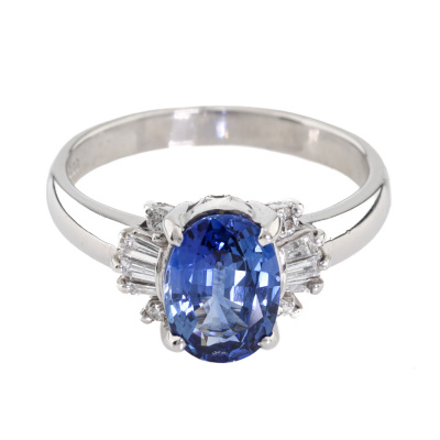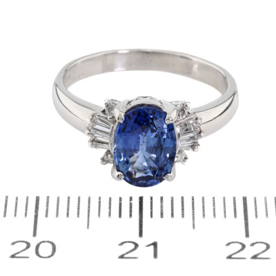 Sapphire and Diamond ring with centre oval shape Natural Blue Sapphire of 1.64ct and round & baguette cut Natural Diamonds totalling 0.16ct. Platinum - 900. Ring size L1/4. Band width: 2.5mm-3.0mm. Weight: 5.2g. (Pre-owned)