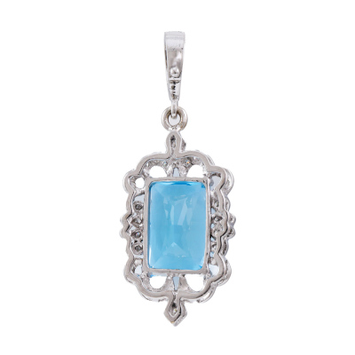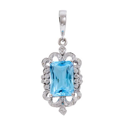 Topaz and Diamond enhancer pendant with centre radiant cut Natural Blue Topaz of approximately 16.50ct and round Natural Diamonds totalling 0.48ct (Estimated grading: G VS). 18ct white gold and 9ct white gold bail. No chain provided. Weight: 15.0g. (Pre-owned).