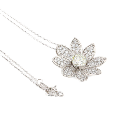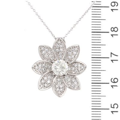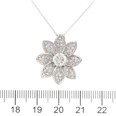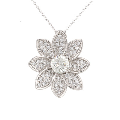 Flower design pendant with a centre round brilliant cut Natural Diamond of 1.03ct (Estimated grading: L-N SI) and remaining round Natural Diamonds totalling 0.62ct (Estimated grading: G-H VS). Platinum 900 with 41cm 18ct white gold chain. Weight: 8.5g. (pre-owned)