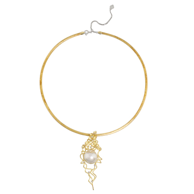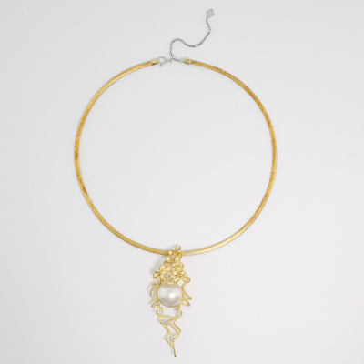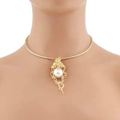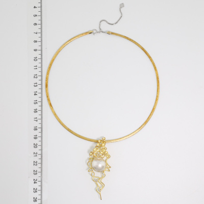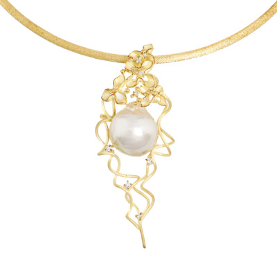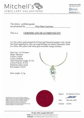 Pearl and Diamond pendant with centre baroque South Sea Pearl approximately size 16.5 x 18.5mm and 7 round Natural Diamonds totalling 0.17ct. 18ct yellow gold with 18ct white & yellow gold reversible omega chain and 18ct white gold extendable chain. Maximum length: 45cm. Weight: 31.3g. With Certificate #421042. (Pre-owned)