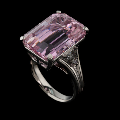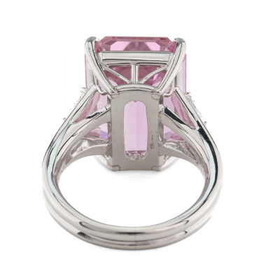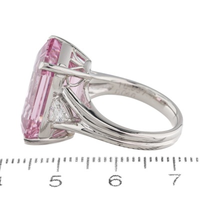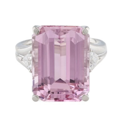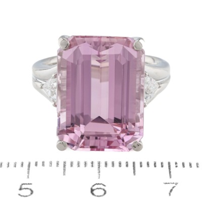 Kunzite and Diamond ring with emerald cut Natural Kunzite of 16.63ct and trilliant cut Natural Diamonds totalling 0.46ct (Estimated grading: F-G VS). Platinum - 900. Ring size N. Band width: 3.3mm - 3.9mm. Weight: 16.0g. (Pre-owned)