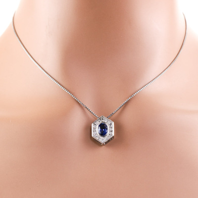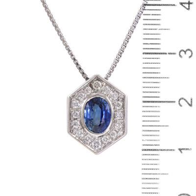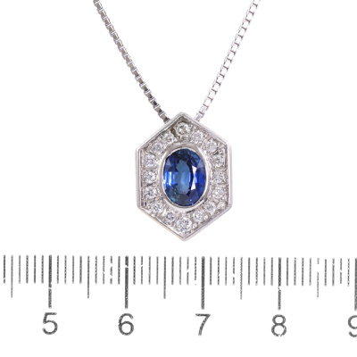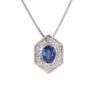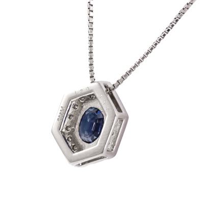 Sapphire and Diamond pendant with centre oval shape Natural Blue Sapphire of 1.66ct and round Natural Diamonds totalling 0.27ct. Platinum-900 with 36cm - 40cm Platinum - 850 adjustable chain. Weight: 9.2g.