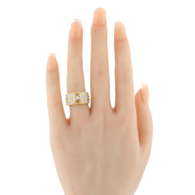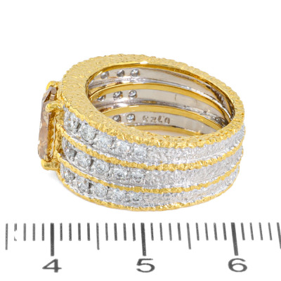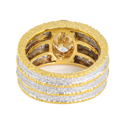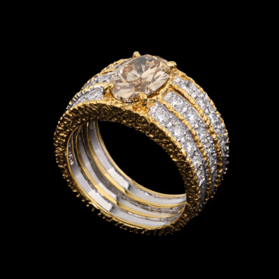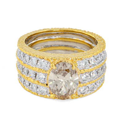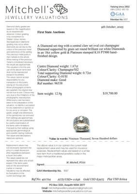 Diamond ring with centre oval shape Natural Diamond of 1.67ct (Estimated grading: Champagne SI2) and round Natural Diamonds totalling 0.72ct (Estimated grading: G-H SI). Platinum - 900 and 18ct yellow gold. Ring size L - 8.8mm. Weight: 12.9g. With Valuation Certificate #421724. (Pre-owned)