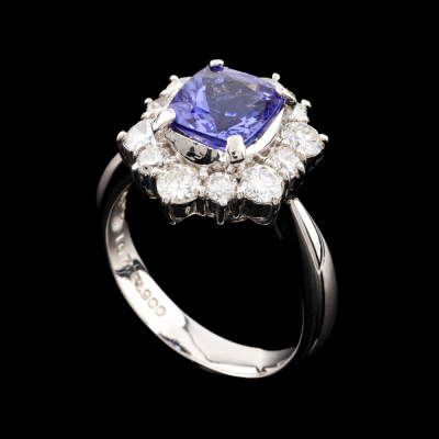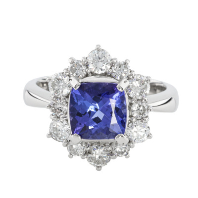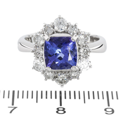 Tanzanite and Diamond ring with cushion cut Natural Tanzanite of 1.67ct and round Natural Diamonds totalling 1.01ct (Estimated grading: G-H SI). Platinum - 900. Ring size: L1/4. Band width: 3.4mm - 2.5mm. Weight: 8.8g. (Pre-owned)