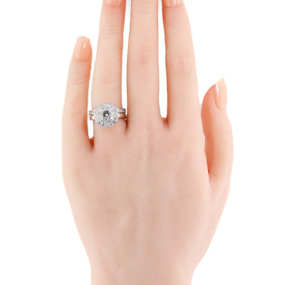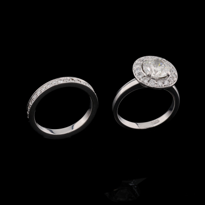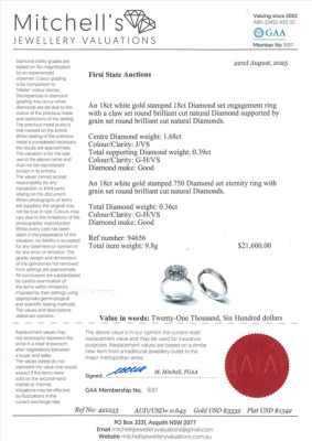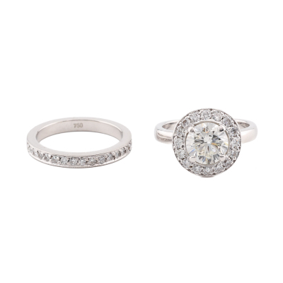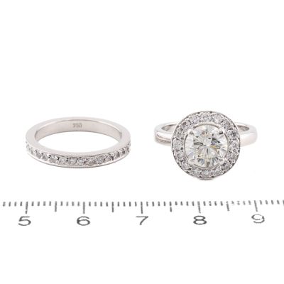 Engagement ring set. 1) Diamond halo ring with centre round brilliant cut Natural Diamond of approx. 1.68ct (Estimated grading: J VS) & round Natural Diamonds approx. 0.39ct (Estimated grading: G-H VS). Ring size: J1/2. 2) Diamond full eternity ring with round Natural Diamonds totalling approx. 0.36ct (Estimated grading: G-H VS). Ring size: K - Ring resizing is not recommended. Both Band width: 2.5mm. 18ct White gold. Total weight: 9.8g. With Valuation Certificate. (Pre-owned)