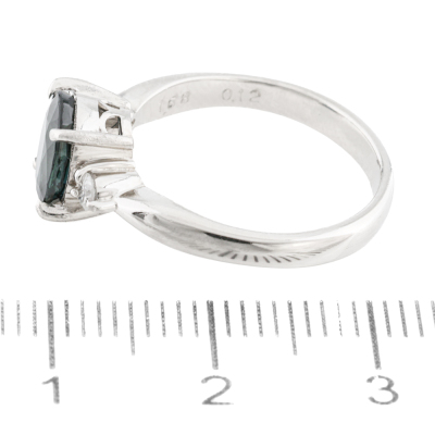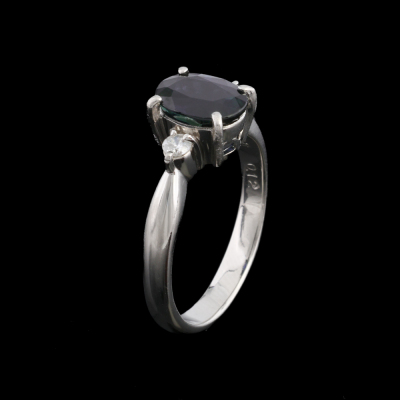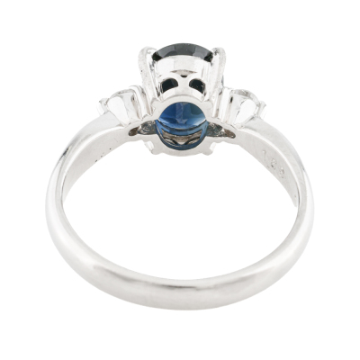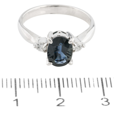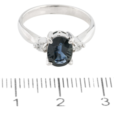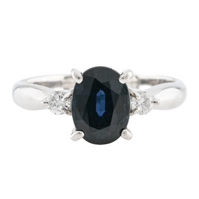 Sapphire and Diamond ring with centre oval shape Natural dark blue Sapphire of 1.68ct and 2 round shoulder Natural Diamonds totalling 0.12ct. Platinum - 900. Ring size K1/2. Band width: 2.6mm - 2.8mm. Weight: 5.0g.