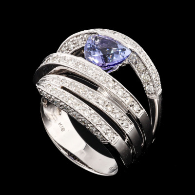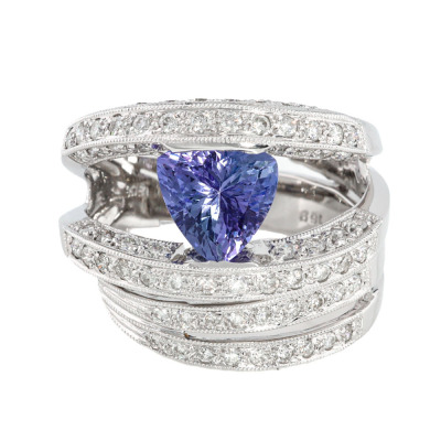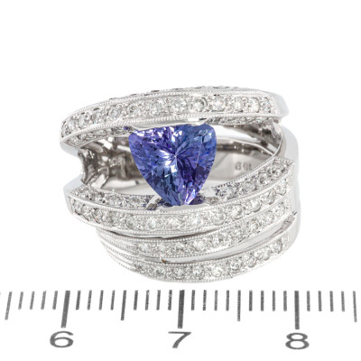 Tanzanite and Diamond ring with a trilliant cut Natural Tanzanite of 1.69ct and round Natural Diamonds totalling 0.86ct (Estimated grading: H-I SI). 18ct white gold. Ring size L1/2. Band width: 4.7mm-8.7mm. Weight: 9.3g. (Pre-owned)