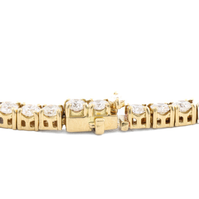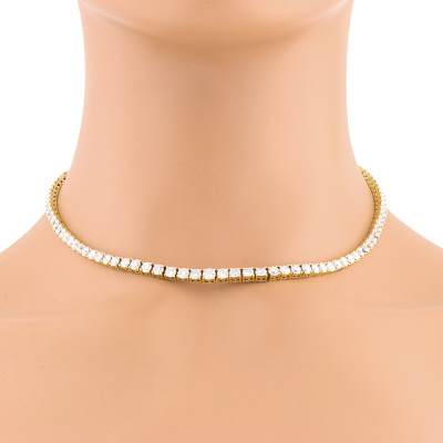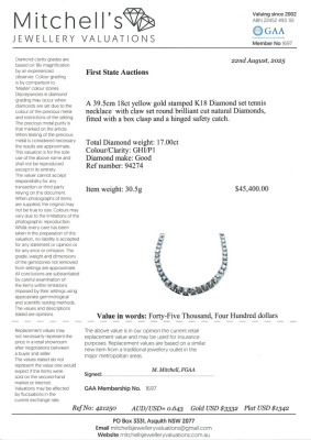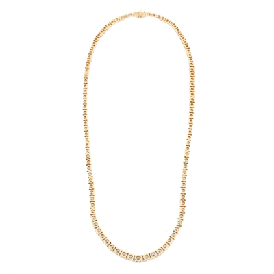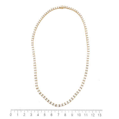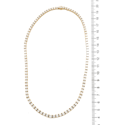 Diamond Tennis necklace with 106 slightly graduated round Natural Diamonds totalling 17.00ct (Estimated grading: GHI P1). 18ct yellow gold. Length: 39.5cm. Weight: 30.5g. With Valuation Certificate #421250. (Pre-owned)