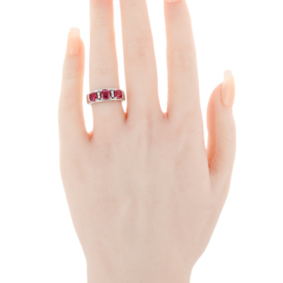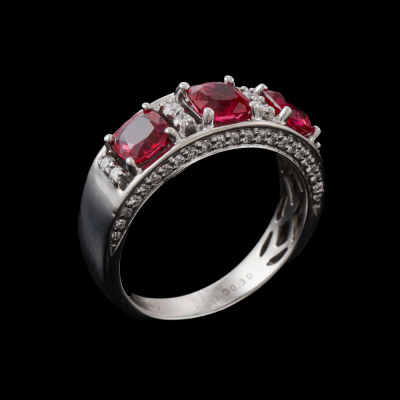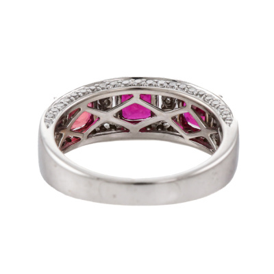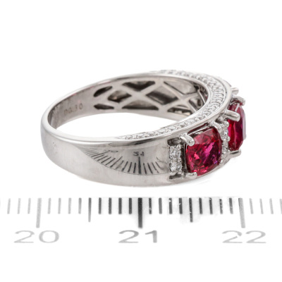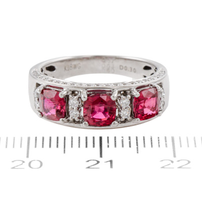 Ruby and Diamond ring with 3 cushion cut Natural Unheated Mozambican Rubies totalling 1.70ct (all with GRS Reports #014051, 014053 & 014048. The 0.63ct Ruby graded by GRS as 'pigeon blood Ruby') and round Natural Diamonds totalling 0.30ct (Estimated grading: G SI). 18ct white gold. Band width: 3.5mm - 4.5mm.