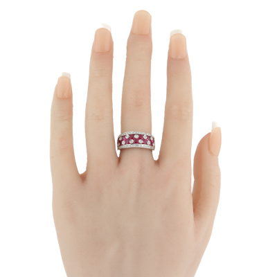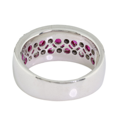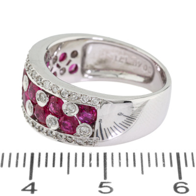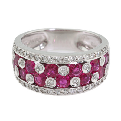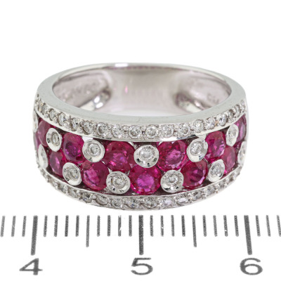 Ruby and Diamond ring with 12 round Natural Rubies totalling 1.71ct and round Natural Diamonds totalling 0.40ct (Estimated grading: HIJ SI) 18ct white gold. Ring size M 3/4. Band width: 5.3mm - 7.0mm. Weight: 7.8g