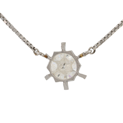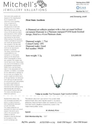 Diamond solitaire pendant with a round brilliant cut Natural Diamond of 1.73ct (Estimated grading: I P2). Platinum - 850 with attached Platinum - 850 chain attached. Length: 41cm. Weight: 5.3g. With Valuation Certificate #422284.
