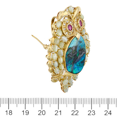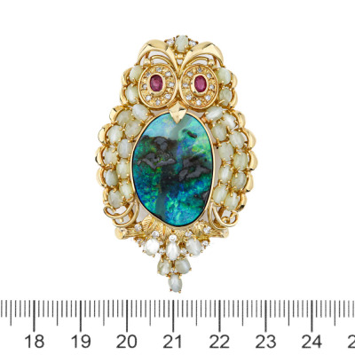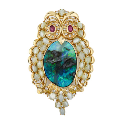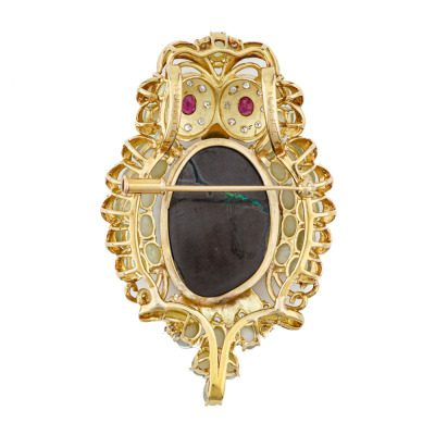 Owl design brooch/pendant with freestyle Natural solid Boulder Opal of 17.44ct, oval cabochon cut Natural cat's eye Chrysoberyl totalling 5.60ct, oval shape Natural Rubies totalling 0.50ct and round Natural Diamonds totalling 0.38ct (Estimated grading: H-I SI). 18ct yellow gold. Size: 5.5cm x 3.5cm. Weight: 22.1g. Note: no chain provided. (Pre-owned)