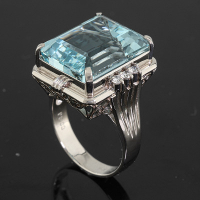 Aquamarine and Diamond ring with centre emerald cut Natural Aquamarine of 17.47ct and 6 round Natural Diamonds totalling 0.24ct. Platinum - 900. Ring size O3/4. Band width: 3.8mm - 4.5mm. Weight: 13.8g. (Pre-owned)