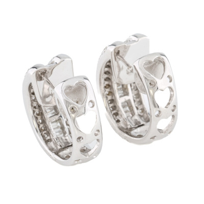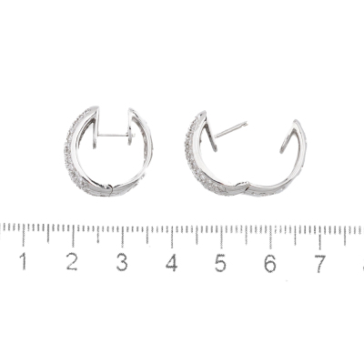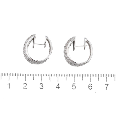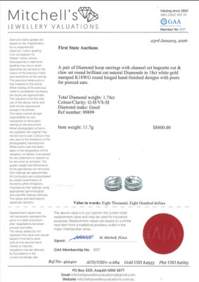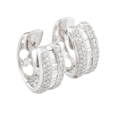 Diamond hoop earrings with round & baguette cut Natural Diamonds totalling 1.74ct (Estimated grading: GH VS-SI). 18ct white gold. Hoop diameter: 2cm x 1.8cm. Width of the hoop: 8.5mm. Weight: 11.7g. With Certificate #422410. (Pre-owned)