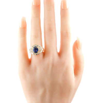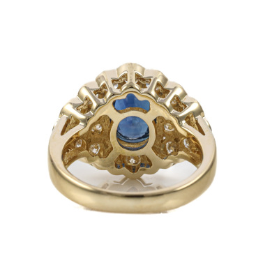 Sapphire and Diamond ring with oval shape Natural Blue Sapphire of 1.75ct and round Natural Diamonds totalling 1.25ct (Estimated grading: G-H SI). 18ct yellow gold. Ring size: J. Band width: 2.6mm - 4mm. Weight: 7.9g. (Pre-owned)