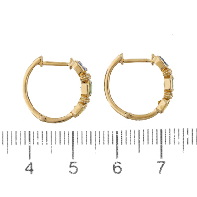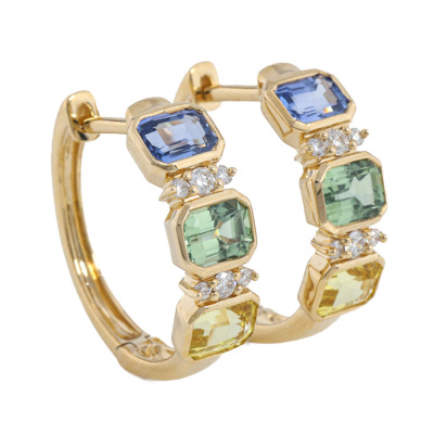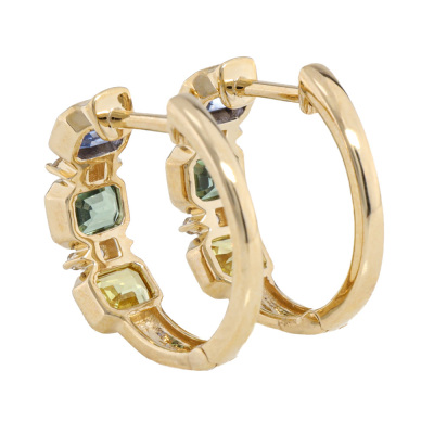 Sapphire and Diamond huggie earrings with emerald cut natural blue, green & yellow Sapphires totalling 1.75ct and round natural Diamonds totalling 0.09ct. 18ct yellow gold. Weight: 3.0g. (New)