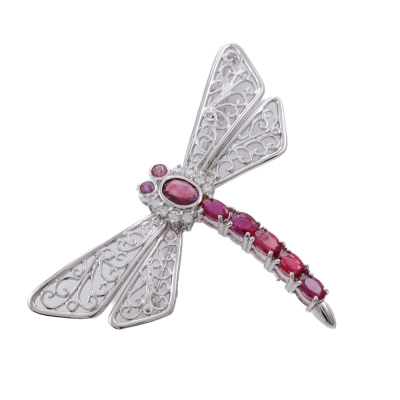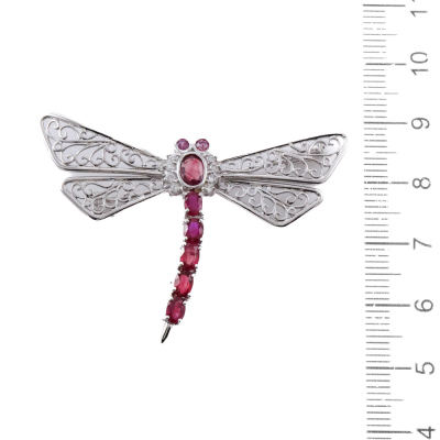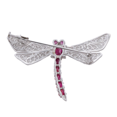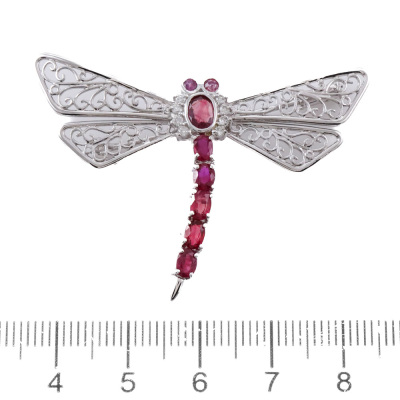 Dragonfly design brooch with filigree detailing, round & oval shape Natural Rubies totalling 1.76ct and 8 round Natural Diamonds totalling 0.12ct. 18ct white gold with 14ct white gold pin. Dimensions: 3.5cm x 4.8cm. Weight: 5.9g.