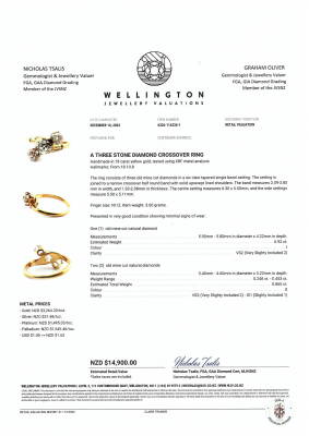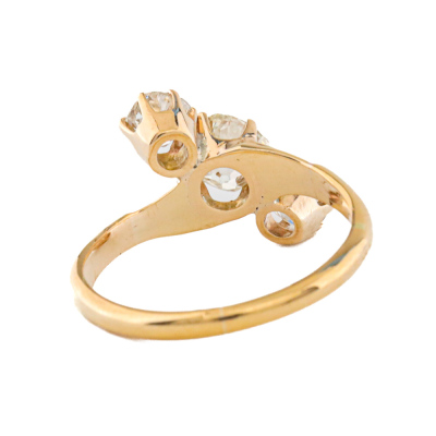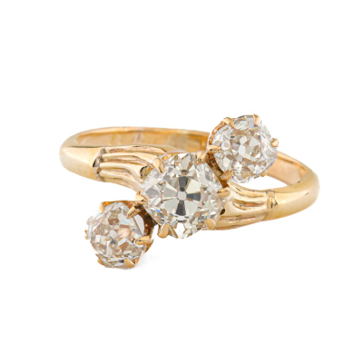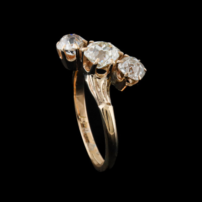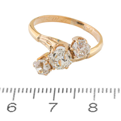 Diamond Dress ring with three cushion shaped Old Mine Cut Natural diamonds totalling 1.78ct (Estimated grading: H-I VS-SI). 18ct yellow gold band with 12ct yellow gold setting (XRS tested), inscribed 18.10.8. Ring size: N 1/2. Band width: 2.0mm - 3.8mm. Weight 3.5g (Pre-owned)