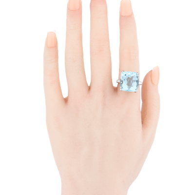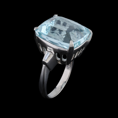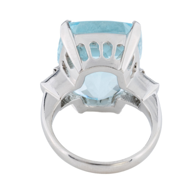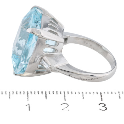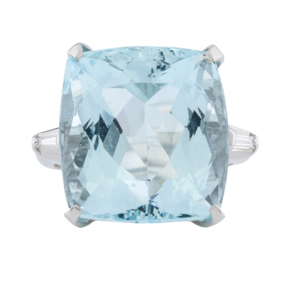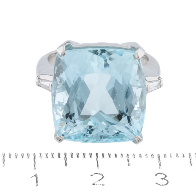 Aquamarine and Diamond ring with cushion cut Natural Aquamarine of 18.01ct and baguette cut Natural Diamonds totalling 0.08ct. Platinum-900. Ring size M. Band width: 2.7mm - 2.5mm. Weight: 14.5g.