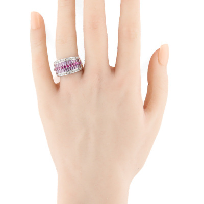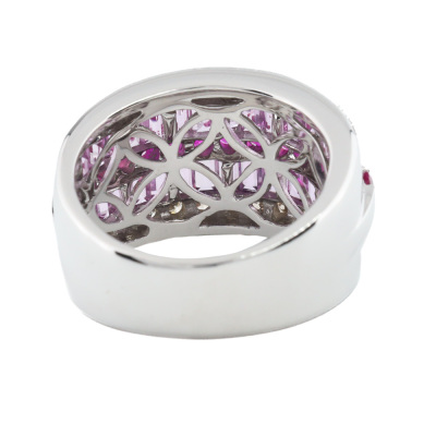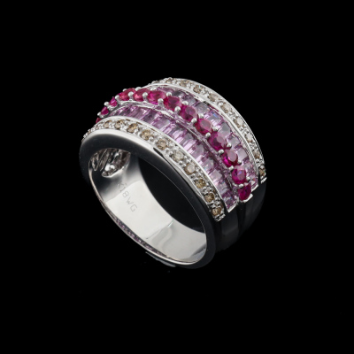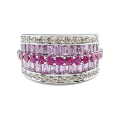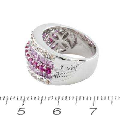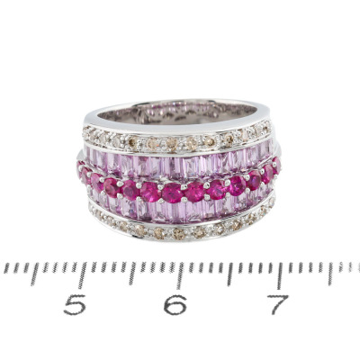 Sapphire, Ruby and Diamond ring with baguette cut Natural Pink Sapphires totalling 1.80ct, round Natural Rubies totalling 0.60ct and round Natural Champagne Diamonds totalling 0.25ct. 18ct white gold. Ring size K. Band width: 6.0mm - 6.8mm. Weight: 9.3g. (Pre-owned)