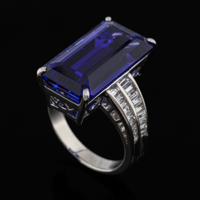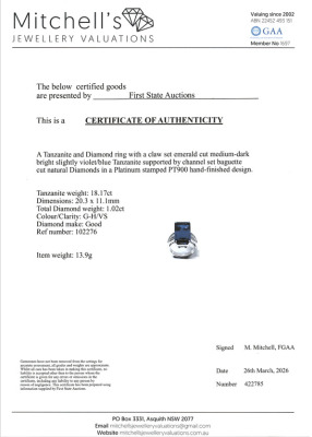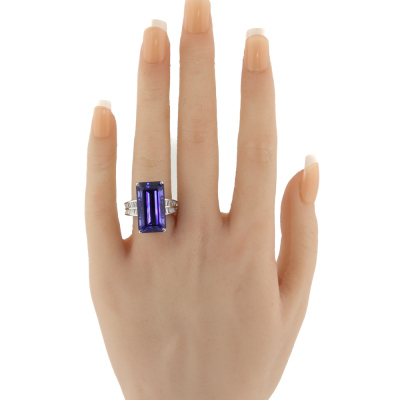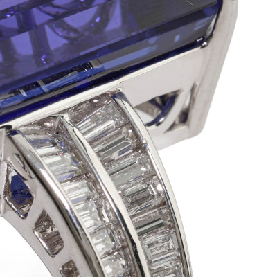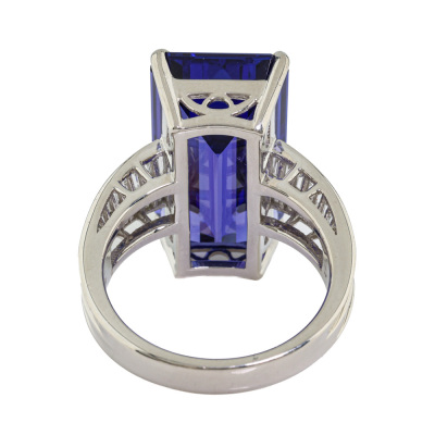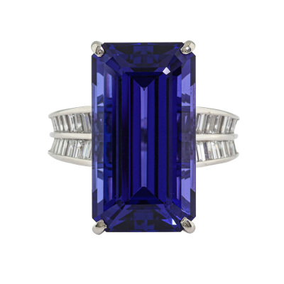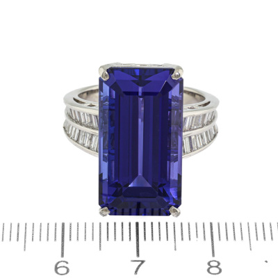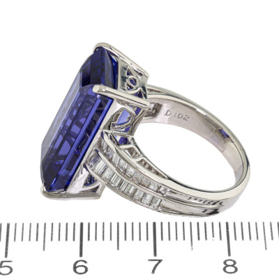 Tanzanite and Diamond ring with emerald cut Natural Tanzanite of 18.17ct and baguette cut Natural Diamonds totalling 1.02ct. (Estimated grading: GH VS). Platinum - 900. Band width: 3.3mm - 5.3mm With Certificate #422785.