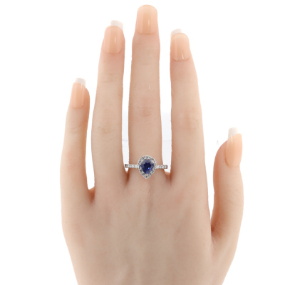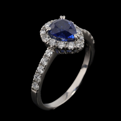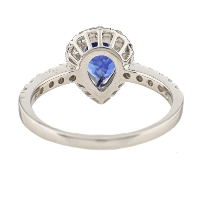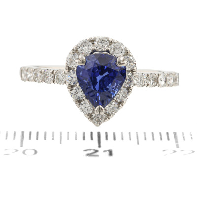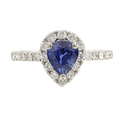 Sapphire and Diamond ring with centre pear shape Natural Cornflower Blue Sapphire of 1.82ct and round Natural Diamonds totalling 0.71ct (Estimated grading: G SI). Platinum 900. Ring size P3/4. Band width: 1.9mm - 2.3mm. Weight: 4.9g. (Pre-owned)