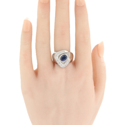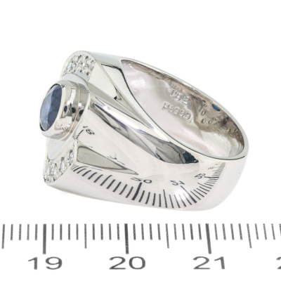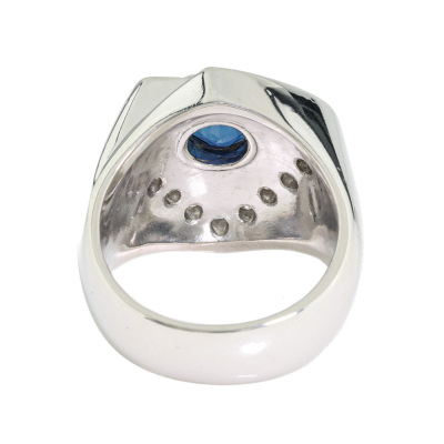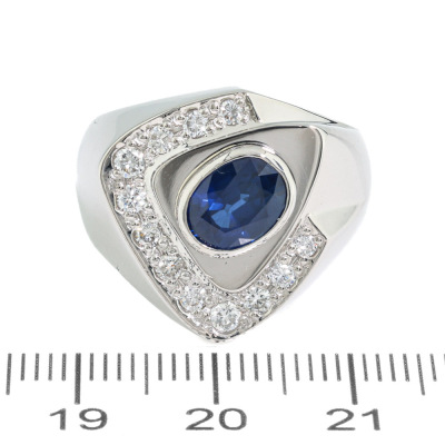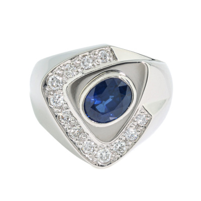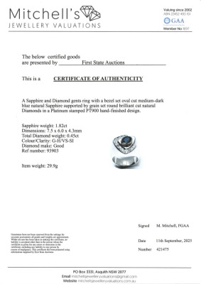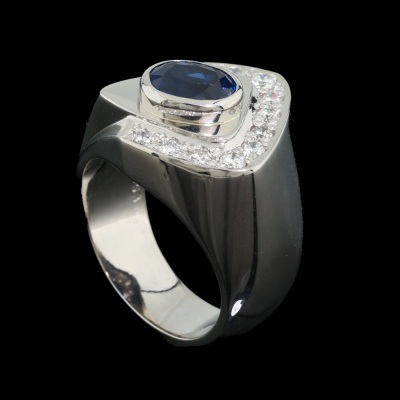 Mens ring with centre oval shape Natural dark blue Sapphire of 1.82ct and round Natural Diamonds totalling 0.45ct (Estimated grading: G-H VS-SI). Platinum - 900. Ring size P 1/4. Band width: 6.5mm - 8.5mm. Weight: 29.9g. With Certificate #421475. (Pre-owned)