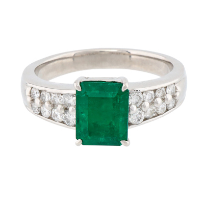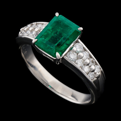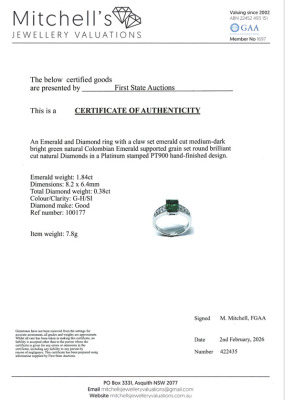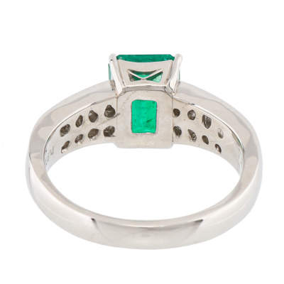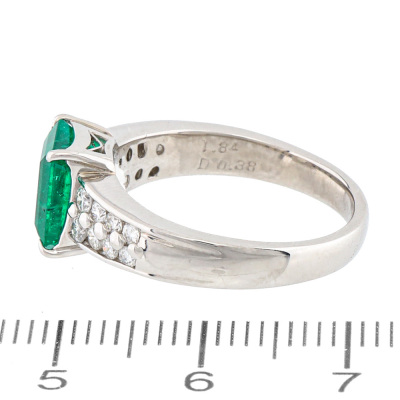 Emerald and Diamond ring with emerald cut Natural Colombian Emerald of 1.84ct and round Natural Diamonds totalling 0.38ct (Estimated grading: GH SI). Platinum - 900. Ring size M3/4. Band width: 2.8mm - 4.0mm. Weight: 7.8g. With Certificate #422435.