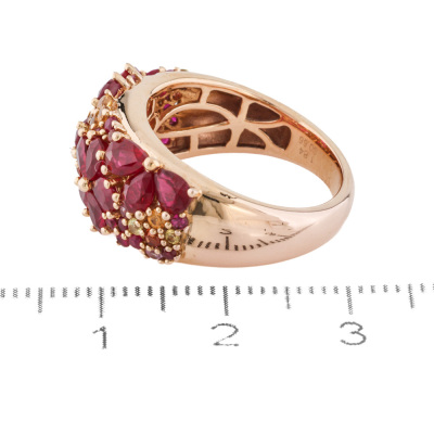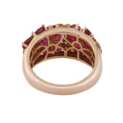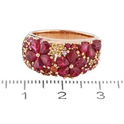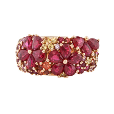 Flora design ring with round Natural Rubies totalling 1.84ct and round multicolour Natural Sapphires (colour including pink, orange & yellow) totalling 0.66ct. 18ct yellow gold. Ring size M. Band width: 3.2mm - 5.2mm. Weight: 7.9g. (Pre-owned)