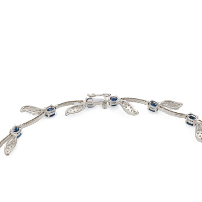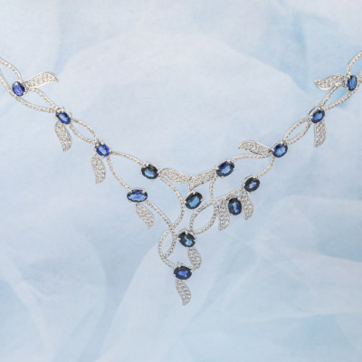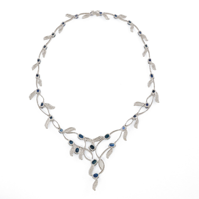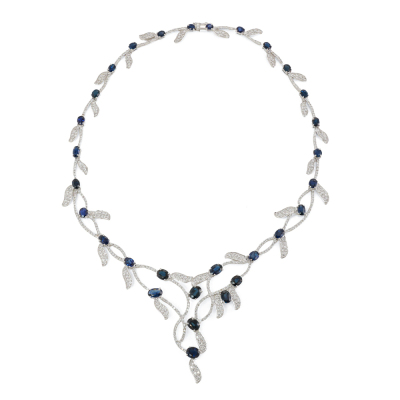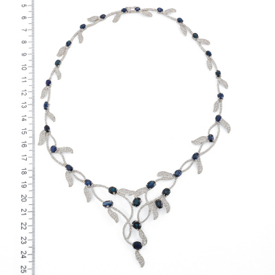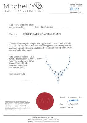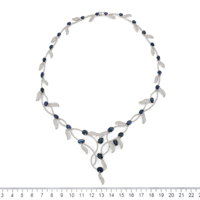 Sapphire and Diamond necklace with oval shape Natural Blue Sapphires totalling 18.60ct and round Natural Diamonds totalling 5.27ct (Estimated grading: H-I SI). 18ct white gold. Length: 41cm. Weight: 46.2g. With Certificate #420358. (Pre-owned)