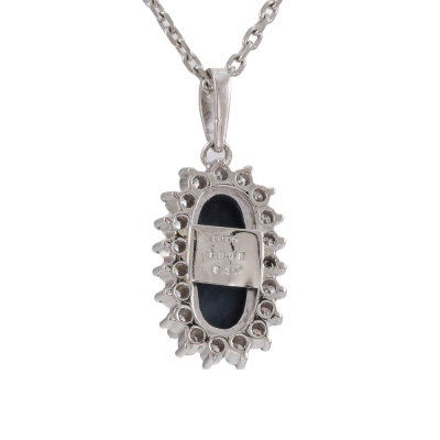 Opal and Diamond pendant with oval cabochon cut Solid Natural Black Opal of 1.86ct and round Natural Diamonds totalling 0.37ct (Estimated grading: G VS). Platinum-900 with 36cm Platinum-850 chain. Weight: 6.4g (Pre-owned)