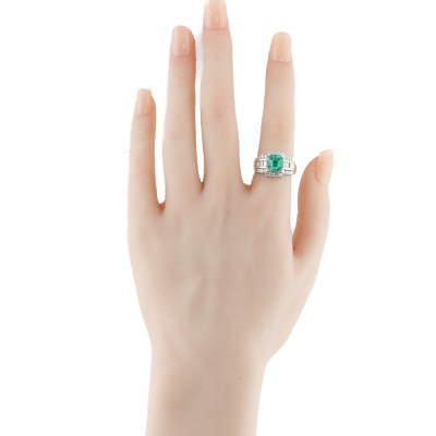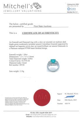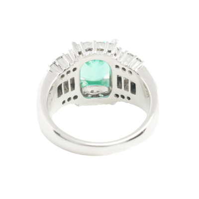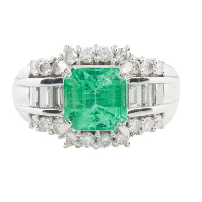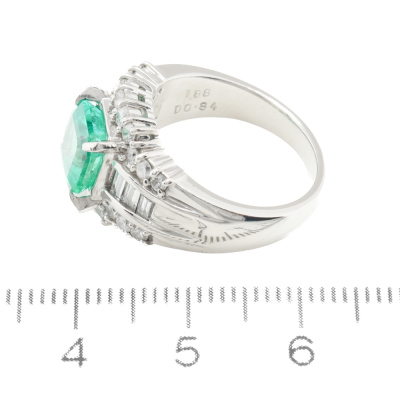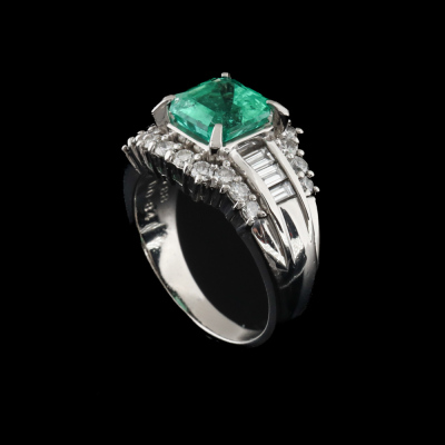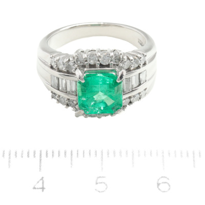Emerald and Diamond ring with emerald cut Natural Colombian Emerald of 1.88ct and round Natural Diamonds totalling 0.84ct (Estimated grading: H-I VS-SI). Platinum - 900. Ring size: K3/4. Band width: 2.6mm - 5.5mm. Weight: 13.8g. With Certificate #420174. (Pre-owned)