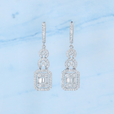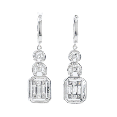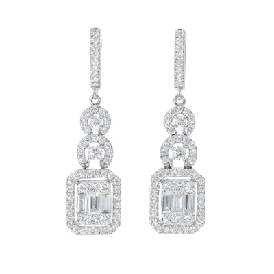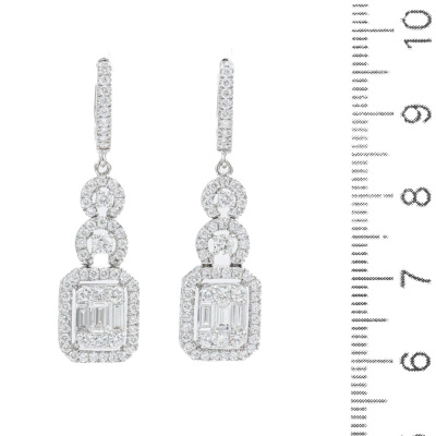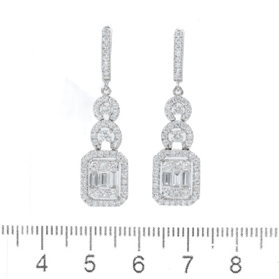 Diamond drop earrings with round, baguette & princess cut Natural Diamonds totalling 1.88ct (Estimated grading: F-G VS). 18ct white gold. Earrings drop length: 3.5cm. Weight: 5.7g. (As New)