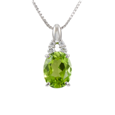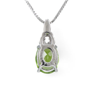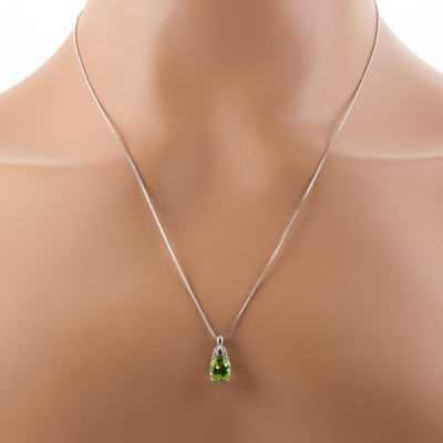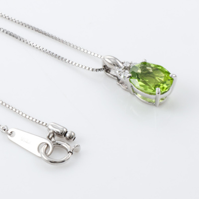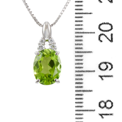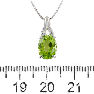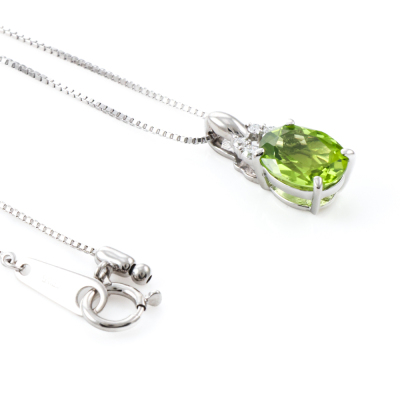 Peridot and Diamond pendant with oval shape Natural Peridot of 1.88ct and round Natural Diamonds totalling 0.07ct. 18ct white gold and 18ct white gold 50cm adjustable chain. Weight: 3.9g. (pre-owned)