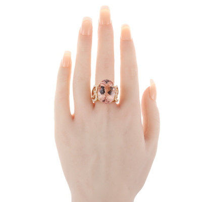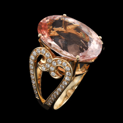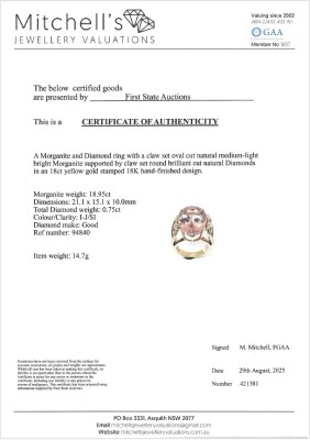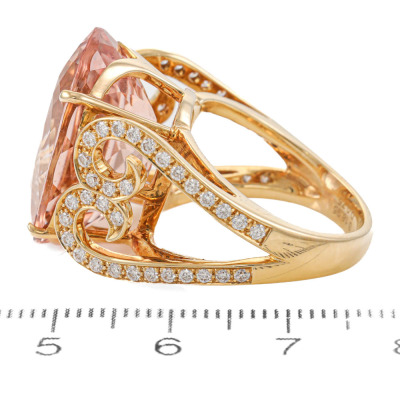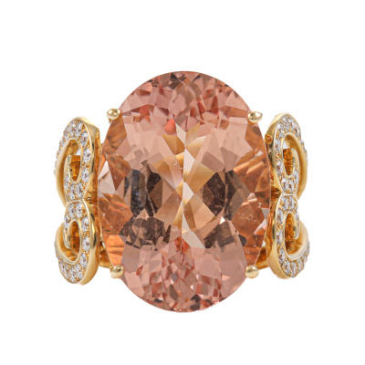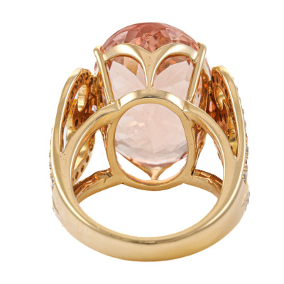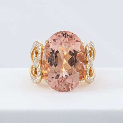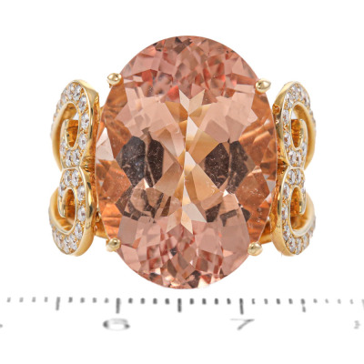 Morganite and Diamond ring with centre oval shape Natural Morganite of 18.95ct and round Natural Diamonds totalling 0.75ct (Estimated grading: I-J SI). 18ct yellow gold. Ring size M3/4. Band width: 3.5mm - 5mm. Weight: 14.7g. With Certificate #421381. (Pre-owned)