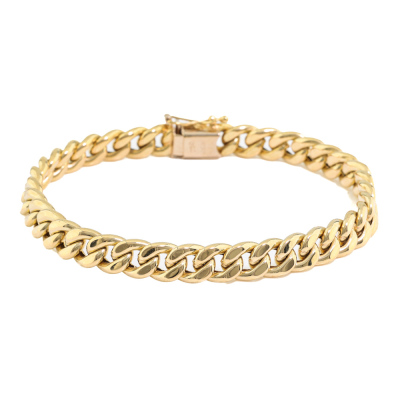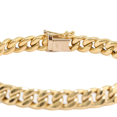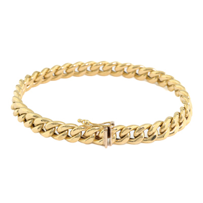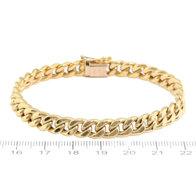 18ct yellow gold hollow curb link bracelet. Length: 19.5cm. Width: 7mm. Weight: 15.4g. (Pre-owned)