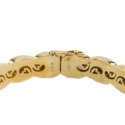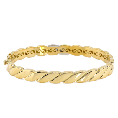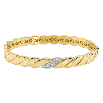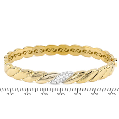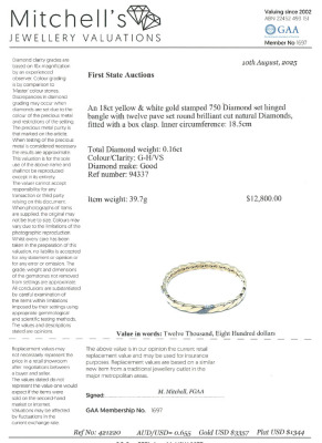 Hinged bangle with 12 pave set round Natural Diamonds totalling approximately 0.16ct. 18ct yellow & white gold. Oval shape, inner circumference: 18.5mm. Weight: 39.7g. With Valuation Certificate #421220. (Pre-owned)