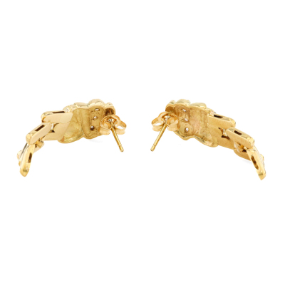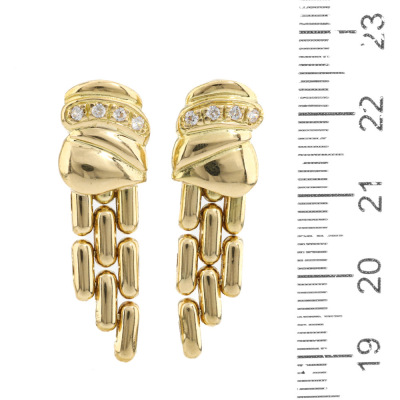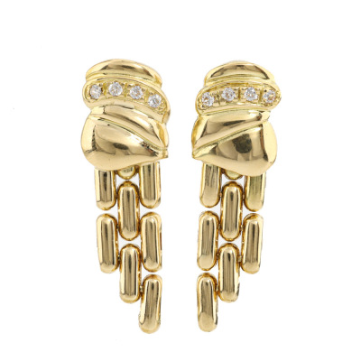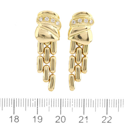 Articulated drop earrings with 8 round Natural Diamonds totalling 0.08ct. 18ct Yellow gold. Earring size: 3.4cm x 1cm. Total weight: 9.0g. (Pre-owned)