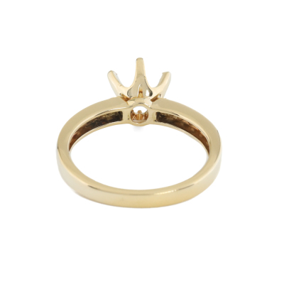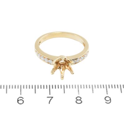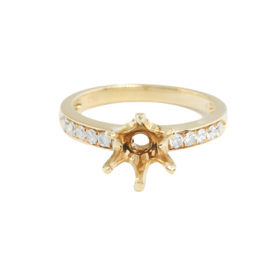18ct yellow gold 6 claw ring semi mount (note centre stone is not included) for 6.5mm centre round stone. With shoulder round Natural Diamonds totalling approximately 0.20ct. Ring size M. Band width: 2.1mm-2.6mm. Weight: 3.6g. (Pre-owned)