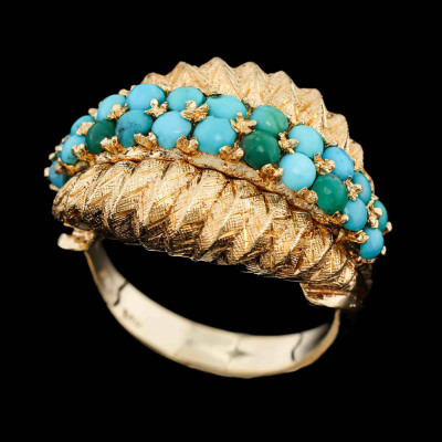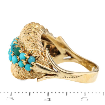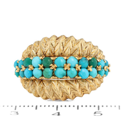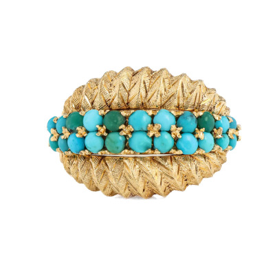 Turquoise ring with round cabochon cut Natural Turquoise totalling approximately 1.10ct. 18ct yellow gold. Ring size N 1/4. Band width: 3.6mm - 2.7mm11.4. Weight: 11.4g. (Pre-owned)