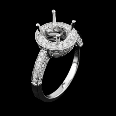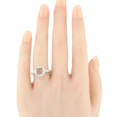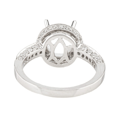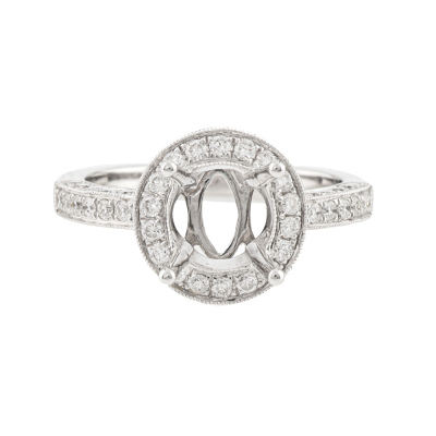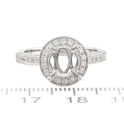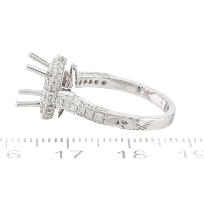 18ct white gold 4 claw semi mount halo ring (note centre stone is not included) for 7.75mm centre round stone. With round Natural Diamonds totalling approximately 0.80ct (Estimated grading: G-H SI). Ring size M. Band width: 2.2mm - 2.3mm. Weight: 4.9g. (As new)