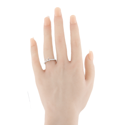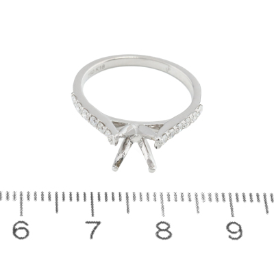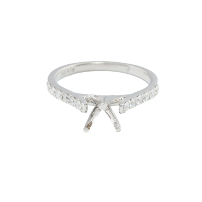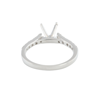18ct white gold 4 claw semi mount ring (note centre stone is not included) for 6.5mm centre round stone. Shoulder round Natural Diamonds totalling approximately 0.24ct. Ring size L1/2. Band width: 1.9mm. Weight: 2.7g. (Pre-owned)