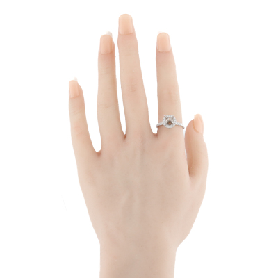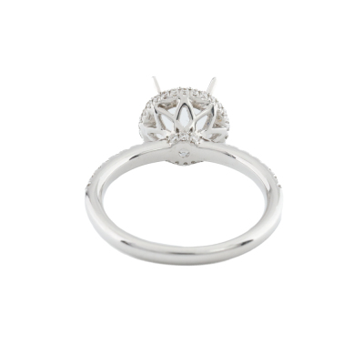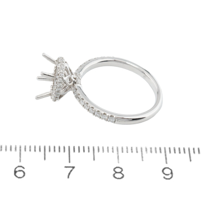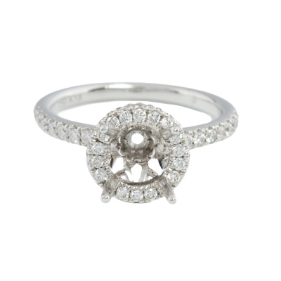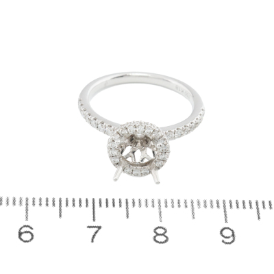 18ct white gold 4 claw semi mount halo ring (note centre stone is not included) for 6.5mm centre round stone. With round Natural Diamonds totalling approximately 0.54ct (Estimated grading: G-H SI). Ring size L1/2. Band width: 1.9mm - 2.1mm. Weight: 3.7g. (As new)