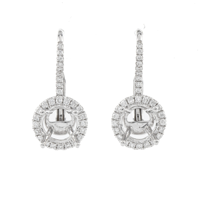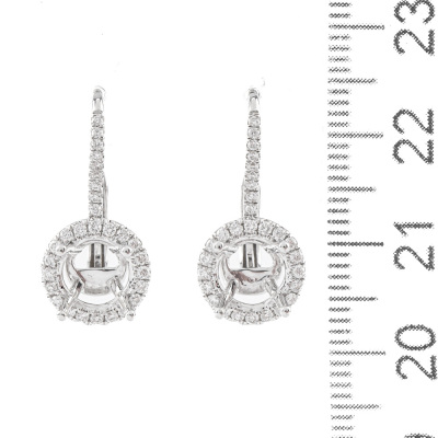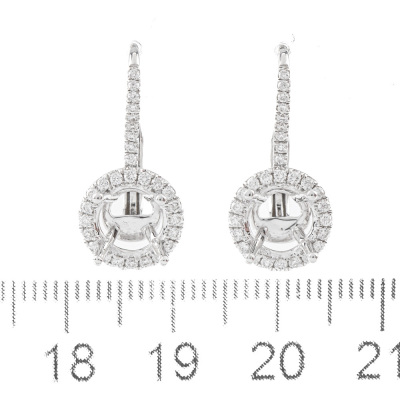 18ct white gold 4 claw semi mount leverback halo drop earrings (note centre stone is not included) for 6.8mm centre round stones. With round Natural Diamonds totalling approximately 0.55ct (Estimated grading: G-H SI). Weight: 4.0g. (As new)