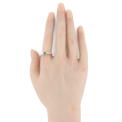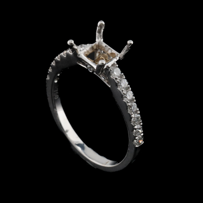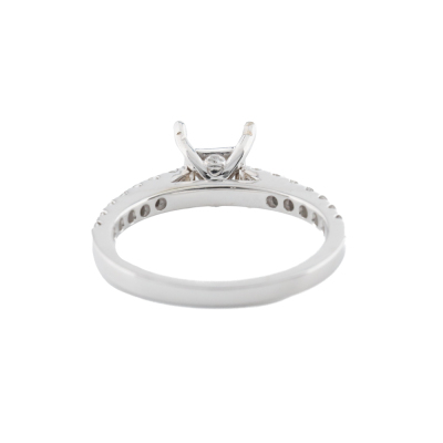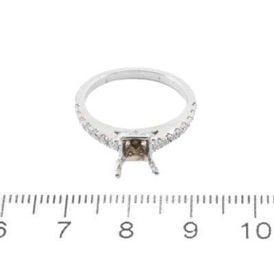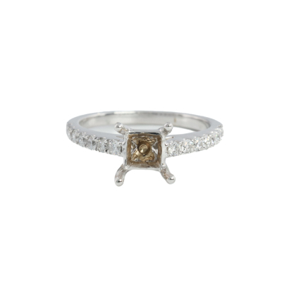 18ct white gold 4 claw semi mount ring (note centre stone is not included) for 5mm centre square shape stone. Shoulder round Natural Diamonds totalling approximately 0.42ct (Estimated grading: G SI). Ring size M. Band width: 1.8mm-2mm. Weight: 3.2g. (Pre-owned)