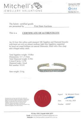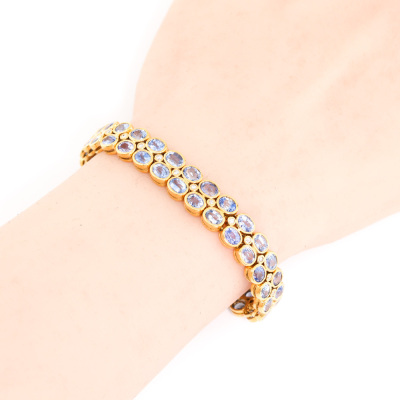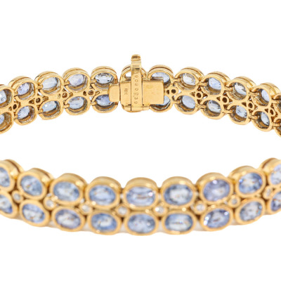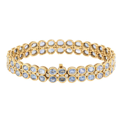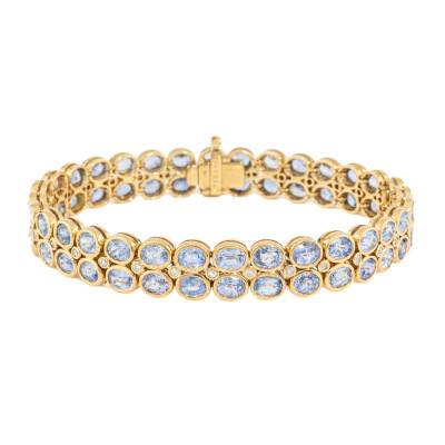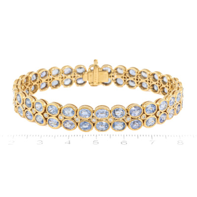 Two row bracelet with oval shape Natural Light Blue Sapphires totalling 19.08ct and round Natural Diamonds totalling 0.39ct (Estimated grading: I-J SI). 18ct yellow gold. Weight: 33.6g. Length: 18.5cm. With Certificate #420987. (Pre-owned)